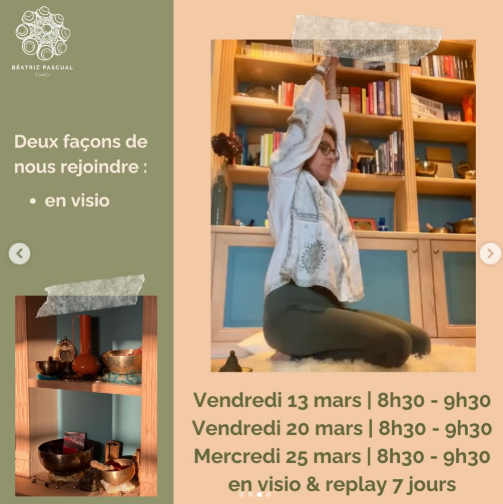 – visio Vendredi 13 février | 8h30 – 9h30. depuis chez toi & replay 7 jours Tarif : 15€ /abon. 5 ou 10 séances – Accès au replay uniquement disponible 7 jours